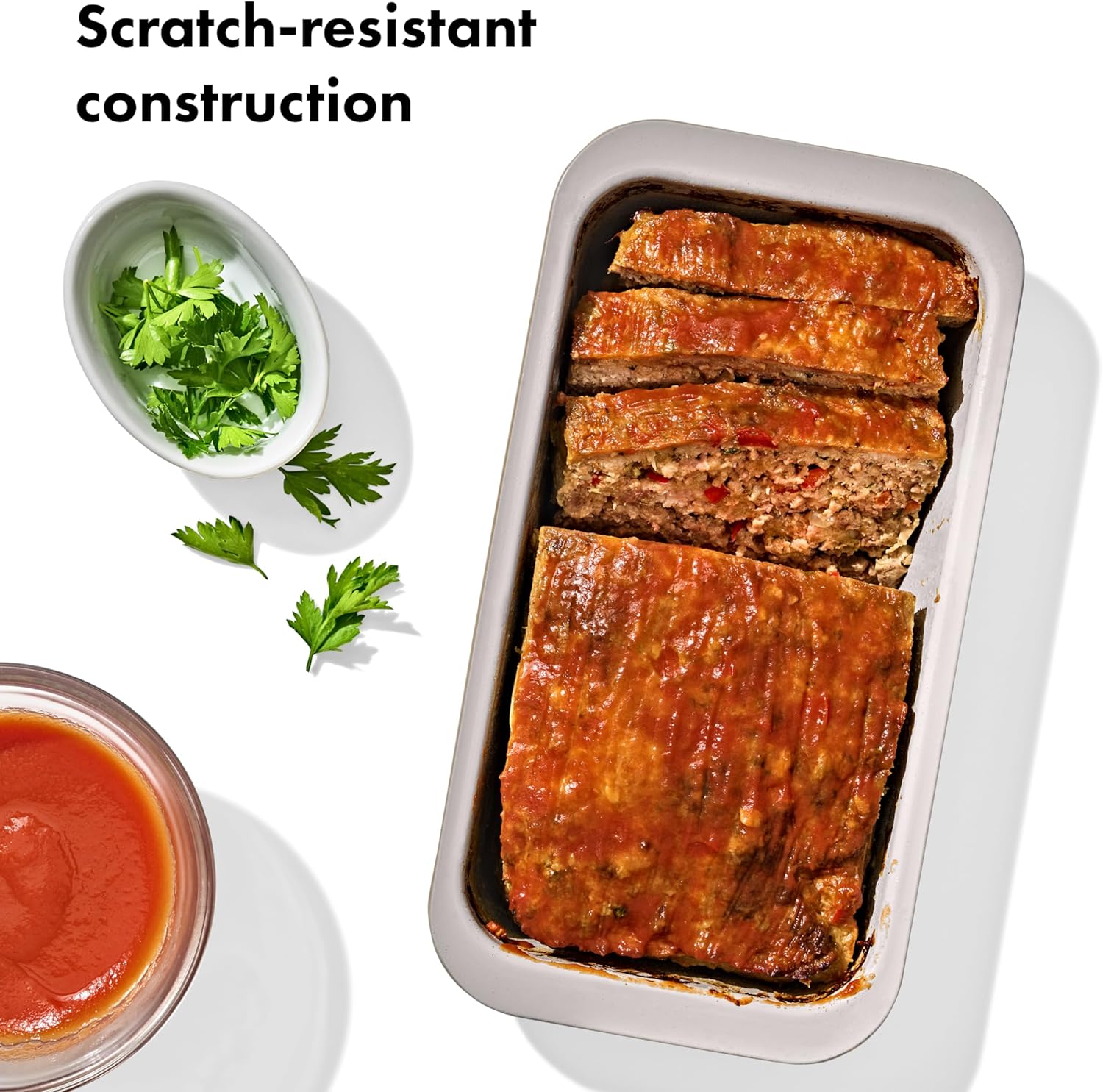 The OXO Good Grips Non-Stick Pro Ceramic Coated Metal Bakeware 1Lb Loaf Pan features a durable metal construction that resists warping and ensures long-lasting performance. The sturdy handles with comfortable grips make it easy to transfer the pan in and out of the oven with confidence.